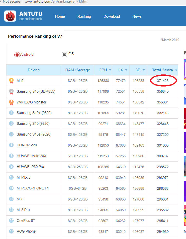 즉, 미 9, 삼성 S10(스냅드래곤 855장착된) 등의 평균 점수이지 최고 점수는 아니라는 점을 기억해야 한다.